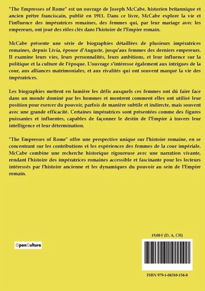 "The Empresses of Rome" est un ouvrage de Joseph McCabe, historien britannique et ancien prêtre franciscain, publié en 1911. Dans ce livre, McCabe explore la vie et l'influence des impératrices romaines, des femmes qui, par leur mariage avec les empereurs, ont joué des rôles clés dans l'histoire de l'Empire romain. McCabe présente une série de biographies détaillées de plusieurs impératrices romaines, depuis Livia, épouse d'Auguste, jusqu'aux femmes des derniers empereurs. Il examine leurs vies, leurs personnalités, leurs ambitions, et leur influence sur la politique et la culture de l'époque. L'ouvrage s'intéresse également aux intrigues de la cour, aux alliances matrimoniales, et aux rivalités qui ont souvent marqué la vie des impératrices. Les biographies mettent en lumière les défis auxquels ces femmes ont dû faire face dans un monde dominé par les hommes et montrent comment elles ont utilisé leur position pour exercer du pouvoir, parfois de manière subtile et indirecte, mais souvent avec une grande efficacité. Certaines impératrices sont présentées comme des figures puissantes et influentes, capables de façonner le destin de l'Empire à travers leur intelligence et leur détermination. "The Empresses of Rome" offre une perspective unique sur l'histoire romaine, en se concentrant sur les contributions et les expériences des femmes de la cour impériale. McCabe combine une recherche historique rigoureuse avec une narration vivante, rendant l'histoire des impératrices romaines accessible et fascinante pour les lecteurs intéressés par l'histoire ancienne et les dynamiques du pouvoir au sein de l'Empire romain.