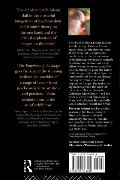 There has long been a politics around the way in which women are represented, with objection not so much to specific images as to a regime of looking which places the represented woman in a particular relationship to the spectator's gaze. Artists have sometimes avoided the representation of women altogether, but they are now producing images which challenge the regime. How do these images succeed in their challenge ? The Emptiness of the Image offers a psychoanalytic answer. Parveen Adams argues that, despite flaws in some of the details of its arguments, psychoanalytic theory retains an overwhelming explanatory strength in relation to questions of sexual difference and representation. She goes on to show how the issue of desire changes the way we can think of images and their effects. Throughout she discusses the work of theorists, artists and filmmakers such as Helene Deutsch, Catherine MacKinnon, Mary Kelly, Francis Bacon, Michael Powell and Della Grace. The Emptiness of the Image shows how the very space of representation can change to provide a new way of thinking the relation between the text and the spectator. It shows how psychoanalytic theory is supple enough to slide into and transform the most unexpected situations.