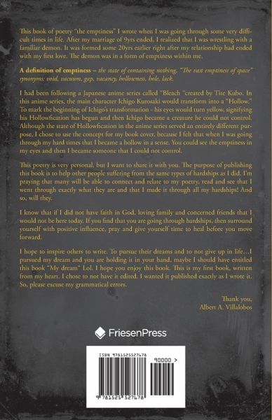 This book of poetry "the emptiness" I wrote when I was going through some very difficult times in life. After my marriage of 9yrs ended, I realized that I was wrestling with a familiar demon. It was formed some 20yrs earlier right after my relationship had ended with my first love. The demon was in a form of emptiness within me. A definition of emptiness - the state of containing nothing, "The vast emptiness of space" synonyms: void, vacuum, gap, vacancy, hollowness, hole, lack. I had been following a Japanese anime series called "Bleach "created by Tite Kubo. In this anime series, the main character Ichigo Kurosaki would transform into a "Hollow." To mark the beginning of Ichigo's transformation - his eyes would turn yellow, signifying his Hollowfication has begun and then Ichigo became a creature he could not control. Although the state of Hollowfication in the anime series served an entirely different purpose, I chose to use the concept for my book cover, because I felt that when I was going through my hard times that I became a hollow in a sense. You could see the emptiness in my eyes and then I became someone that I could not control. This poetry is very personal, but I want to share it with you. The purpose of publishing this book is to help other people suffering from the same types of hardships as I did. I'm praying that many will be able to connect and relate to my poetry, read and see that I went through exactly what they are and that I made it through all my hardships! And so, will they. I know that if I did not have faith in God, loving family and concerned friends that I would not be here today. If you find that you are going through hardships, then surround yourself with positive influence, pray and give yourself time to heal before you move forward. I hope to inspire others to write. To pursue their dreams and to not give up in life...I pursued my dream and you are holding it in your hand, maybe I should have entitled this book "My dream" Lol. I hope you enjoy this book. This is my first book, written from my heart. I chose to not have it edited. I wanted it published exactly as I wrote it. So, please excuse my grammatical errors. Thank you, Albert A. Villalobos
