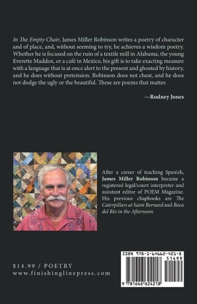 In The Empty Chair, James Miller Robinson writes a poetry of character and of place, and, without seeming to try, he achieves a wisdom poetry. Whether he is focused on the ruin of a textile mill in Alabama, the young Everette Maddox, or a café in Mexico, his gift is to take exacting measure with a language that is at once alert to the present and ghosted by history, and he does without pretension. Robinson does not cheat, and he does not dodge the ugly or the beautiful. These are poems that matter. -Rodney Jones