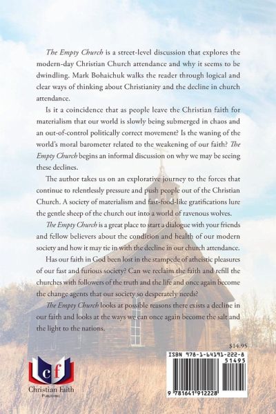 The Empty Church is a street-level discussion that explores the modern-day Christian Church attendance and why it seems to be dwindling. Mark Bohaichuk walks the reader through logical and clear ways of thinking about Christianity and the decline in church attendance. Is it a coincidence that as people leave the Christian faith for materialism that our world is slowly being submerged in chaos and an out-of-control politically correct movement? Is the waning of the worlds moral barometer related to the weakening of our faith? The Empty Church begins an informal discussion on why we may be seeing these declines. The author takes us on an explorative journey to the forces that continue to relentlessly pressure and push people out of the Christian Church. A society of materialism and fast-food-like gratifications lure the gentle sheep of the church out into a world of ravenous wolves. The Empty Church is a great place to start a dialogue with your friends and fellow believers about the condition and health of our modern society and how it may tie in with the decline in our church attendance. Has our faith in God been lost in the stampede of atheistic pleasures of our fast and furious society? Can we reclaim the faith and refill the churches with followers of the truth and the life and once again become the change agents that our society so desperately needs? The Empty Church looks at possible reasons there exists a decline in our faith and looks at the ways we can once again become the salt and the light to the nations.