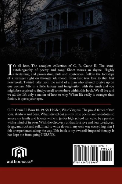 It's all here. The complete collection of C. R. Crane II. The semi-autobiography of poetry and song. Short stories in rhyme. Highly entertaining and provocative, dark and mysterious. Follow the footsteps of a teenager right on through adulthood. From first true love to that first heartbreak. Twisted tales from the mind of a man who refused to give up on one woman. Mix in a little fantasy and imagination with the truth and you might be surprised to find yourself somewhere within this book. We all live and we all die. It's only a matter of how or why. When life really is stranger than fiction, it opens your eyes.