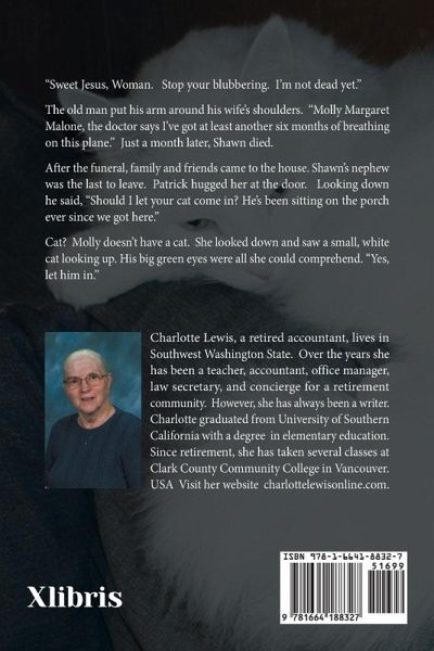 "Sweet Jesus, Woman. Stop your blubbering. I'm not dead yet." The old man put his arm around his wife's shoulders. "Molly Margaret Malone, the doctor says I've got at least another six months of breathing on this plane." Just a month later, Shawn died. After the funeral, family and friends came to the house. Shawn's nephew was the last to leave. Patrick hugged her at the door. Looking down he said, "Should I let your cat come in? He's been sitting on the porch ever since we got here." Cat? Molly doesn't have a cat. She looked down and saw a small, white cat looking up. His big green eyes were all she could comprehend. "Yes, let him in."