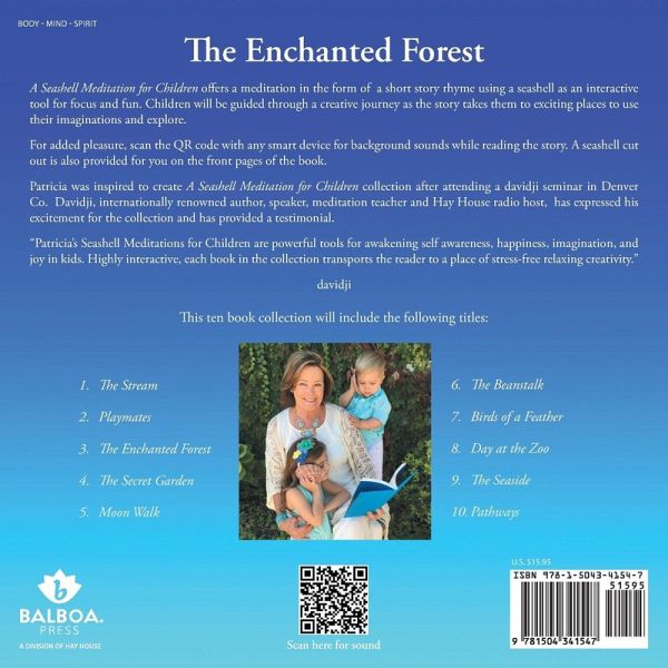 The Enchanted Forest A Seashell Meditation for Children offers a meditation in the form of a short story rhyme using a seashell as an interactive tool for focus and fun. Children will be guided through a creative journey as the story takes them to exciting places to use their imaginations and explore. For added pleasure, scan the QR code with any smart device for background sounds while reading the story. A seashell cut out is also provided for you on the front pages of the book. Patricia was inspired to create A Seashell Meditation for Children collection after attending a davidji seminar in Denver Co. Davidji, internationally renowned author, speaker, meditation teacher and Hay House radio host, has expressed his excitement for the collection and has provided a testimonial. "Patricia's Seashell Meditations for Children are powerful tools for awakening self awareness, happiness, imagination, and joy in kids. Highly interactive, each book in the collection transports the reader to a place of stress-free relaxing creativity." davidji This ten book collection will include the following titles: The Stream Playmates The Enchanted Forest The Secret Garden Moon Walk The Beanstalk Birds of a Feather Day at the Zoo The Seaside Pathways