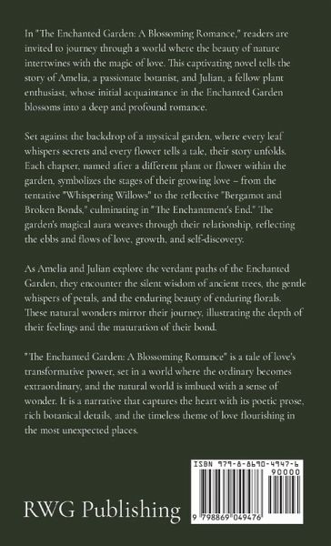 In "The Enchanted Garden: A Blossoming Romance," readers are invited to journey through a world where the beauty of nature intertwines with the magic of love. This captivating novel tells the story of Amelia, a passionate botanist, and Julian, a fellow plant enthusiast, whose initial acquaintance in the Enchanted Garden blossoms into a deep and profound romance. Set against the backdrop of a mystical garden, where every leaf whispers secrets and every flower tells a tale, their story unfolds. Each chapter, named after a different plant or flower within the garden, symbolizes the stages of their growing love - from the tentative "Whispering Willows" to the reflective "Bergamot and Broken Bonds," culminating in "The Enchantment's End." The garden's magical aura weaves through their relationship, reflecting the ebbs and flows of love, growth, and self-discovery. As Amelia and Julian explore the verdant paths of the Enchanted Garden, they encounter the silent wisdom of ancient trees, the gentle whispers of petals, and the enduring beauty of enduring florals. These natural wonders mirror their journey, illustrating the depth of their feelings and the maturation of their bond. "The Enchanted Garden: A Blossoming Romance" is a tale of love's transformative power, set in a world where the ordinary becomes extraordinary, and the natural world is imbued with a sense of wonder. It is a narrative that captures the heart with its poetic prose, rich botanical details, and the timeless theme of love flourishing in the most unexpected places. Perfect for fans of magical realism and contemporary romance, this novel is a testament to the enduring beauty of nature and the magic inherent in human connection. Step into "The Enchanted Garden" and watch as a beautiful romance blooms in the most magical of settings.