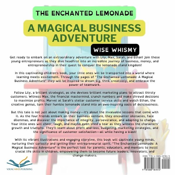 Get ready to embark on an extraordinary adventure with Lily, Max, Sarah, and Ethan! Join these young entrepreneurs as they dive headfirst into an incredible journey of business, money, and entrepreneurship in their quest to conquer the lemonade stand kingdom! In this captivating children's book, your little ones will be transported into a world where learning meets excitement. Through the pages of "The Enchanted Lemonade: A Magical Business Adventure" they will be inspired to dream big, think creatively, and embrace the power of teamwork. Follow Lily, a brilliant strategist, as she devises brilliant marketing plans to attract thirsty customers. Witness Max, the financial mastermind, crunch numbers and make shrewd decisions to maximize profits. Marvel at Sarah's stellar customer service skills and watch Ethan, the creative genius, turn their humble lemonade stand into an awe-inspiring oasis of deliciousness. But this tale is not just about making money-it's about the invaluable lessons that come with it. As the four friends embark on their business venture, they encounter obstacles, face dilemmas, and discover the importance of integrity, perseverance, and adapting to change. Your little ones will cheer, laugh, and maybe even shed a tear as they witness the characters' growth and triumphs. Through this epic educational story, "The Enchanted Lemonade: A Magical Business Adventure" seamlessly weaves essential business concepts into a mesmerizing narrative, ensuring that your children develop a solid foundation in financial literacy and entrepreneurship. They'll learn about profit and loss, budgeting, marketing strategies, and the significance of customer satisfaction-all while having a blast! With its vibrant illustrations and engaging storyline, this book will captivate young minds, nurturing their curiosity and igniting their entrepreneurial spirit. "The Enchanted Lemonade: A Magical Business Adventure" is the perfect tool for parents, educators, and mentors to instill crucial life skills in children, empowering them to become future leaders, innovators, and change-makers. So, what are you waiting for? Dive into this enchanting world of lemonade stands and watch your children's imaginations soar. Join Lily, Max, Sarah, and Ethan on their unforgettable journey and inspire your little ones to dream big, embrace challenges, and excel in the wonderful world of business! Grab your copy of "The Enchanted Lemonade: A Magical Business Adventure" today and set your child on the path to becoming the next great entrepreneur!