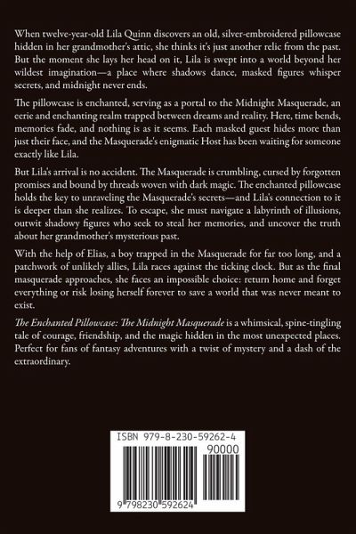 When twelve-year-old Lila Quinn discovers an old, silver-embroidered pillowcase hidden in her grandmother's attic, she thinks it's just another relic from the past. But the moment she lays her head on it, Lila is swept into a world beyond her wildest imagination-a place where shadows dance, masked figures whisper secrets, and midnight never ends. The pillowcase is enchanted, serving as a portal to the Midnight Masquerade, an eerie and enchanting realm trapped between dreams and reality. Here, time bends, memories fade, and nothing is as it seems. Each masked guest hides more than just their face, and the Masquerade's enigmatic Host has been waiting for someone exactly like Lila. But Lila's arrival is no accident. The Masquerade is crumbling, cursed by forgotten promises and bound by threads woven with dark magic. The enchanted pillowcase holds the key to unraveling the Masquerade's secrets-and Lila's connection to it is deeper than she realizes. To escape, she must navigate a labyrinth of illusions, outwit shadowy figures who seek to steal her memories, and uncover the truth about her grandmother's mysterious past. With the help of Elias, a boy trapped in the Masquerade for far too long, and a patchwork of unlikely allies, Lila races against the ticking clock. But as the final masquerade approaches, she faces an impossible choice: return home and forget everything or risk losing herself forever to save a world that was never meant to exist. The Enchanted Pillowcase: The Midnight Masquerade is a whimsical, spine-tingling tale of courage, friendship, and the magic hidden in the most unexpected places. Perfect for fans of fantasy adventures with a twist of mystery and a dash of the extraordinary.