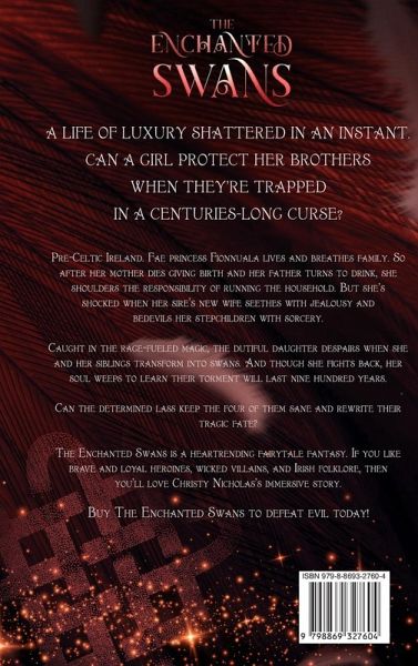 In a realm of ancient enchantment, a life of opulence shatters like fragile glass. Can a young girl shield her brothers from the clutches of a centuries-old curse? Pre-Celtic Ireland. Fae princess Fionnuala knows no greater love that that for her family. But when tragedy strikes and her mother dies in childbirth, her father's descent into despair sends their once-golden world into a spiral of fear. With her new stepmother consumed by jealousy and wielding wicked sorcery, Fionnuala's devotion to her siblings is her only hope. Her world crumbles further when she and her brothers are ensnared in a malevolent spell, transforming them into swans. Determined to defy their cruel fate, Fionnuala must summon every ounce of courage as she embarks on a quest to break the curse that binds them-for a staggering nine hundred years. Can this indomitable young heroine navigate treacherous waters and rewrite the tragic tapestry of their lives? The Enchanted Swans weaves a spellbinding tapestry of heartache and hope-a timeless fairy tale retelling. Join Fionnuala on her journey as she confronts daunting challenges, battles wicked adversaries, and journeys through the captivating wonders of Irish folklore. Christy Nicholas conjures a mesmerizing tale that will transport you to a world of enchantment. Read The Enchanted Swans and embark on a magical quest of good triumphing over evil!