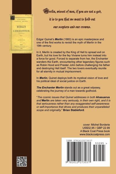 Edgar Quinet's Merlin (1860) is an epic masterpiece and one of the first works to revisit the myth of Merlin in the 19th century. In it, Merlin is created by the King of Hell to spread evil on Earth, but his love for the fey Viviane turns him instead into a force for good. Forced to separate from her, the Enchanter wanders the Earth, encountering other legendary figures such as Robin Hood and Prester John before challenging his father and destroying Hell itself. The two lovers eventually reunite for all eternity in mutual imprisonment. In Merlin, Quinet deploys both its mystical vision of love and his political ideal of social justice on Earth. The Enchanter Merlin stands out as a great odyssey, celebrating the journey of a man towards godhood.