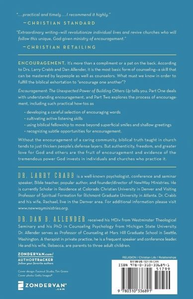 According to Drs. Larry Crabb and Dan Allender, encouragement is more than a compliment or a pat on the back. It's a skill that can be mastered by anyone. Crabb and Allender ask: "What must we know in order to fulfill the biblical exhortation to 'encourage one another?'" Encouragement provides the answer. Part one deals with understanding encouragement, and part two explores the process of encouragement, including such practical how-tos as developing a careful selection of encouraging words; cultivating active listening skills; using biblical fellowship to move beyond superficial smiles and shallow greetings; and recognizing subtle opportunities for encouragement. Without the encouragement of a caring community, biblical truth taught in church tends to just thicken people's defense layers. But authenticity, freedom, and greater love for God and others are the fruit of encouragement, and evidence of the tremendous power God invests in individuals who practice it.