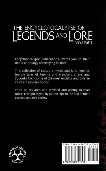 Encyclopocalypse Publications invites you to their debut anthology of terrifying folklore. This collection of macabre myths and lurid legends feature tales of Perchta and watchers, sirens and Squonks from some of the most exciting and diverse voices in modern horror. You'll be titillated and terrified and aching to read more. Brought to you by Janine Pipe in the first of their Legends and Lore series. Includes stories from Stephanie Ellis, Ross Jeffery, R. J. Joseph, Rayne King, Brennan LaForo, Tim Meyer, Mo Moshaty, Bret Nelson, Mocha Pennington, Stephanie Rabig, Judith Sonnet, Markus J. Williams, and Ken Winkler.