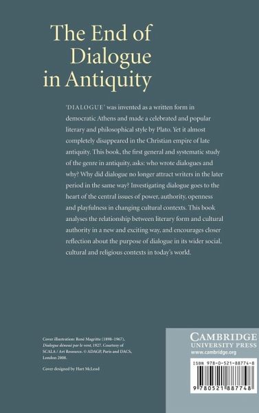 'Dialogue' was invented as a written form in democratic Athens and made a celebrated and popular literary and philosophical style by Plato. Yet it almost completely disappeared in the Christian empire of late antiquity. This book, a general and systematic study of the genre in antiquity, asks: who wrote dialogues and why? Why did dialogue no longer attract writers in the later period in the same way? Investigating dialogue goes to the heart of the central issues of power, authority, openness and playfulness in changing cultural contexts. This book analyses the relationship between literary form and cultural authority in a new and exciting way, and encourages closer reflection about the purpose of dialogue in its wider social, cultural and religious contexts in today's world.