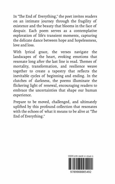 In "The End of Everything," the poet invites readers on an intimate journey through the fragility of existence and the beauty that blooms in the face of despair. Each poem serves as a contemplative exploration of life's transient moments, capturing the delicate dance between hope and hopelessness, love and loss. With lyrical grace, the verses navigate the landscapes of the heart, evoking emotions that resonate long after the last line is read. Themes of mortality, transformation, and resilience weave together to create a tapestry that reflects the inevitable cycles of beginning and ending. In the clutches of darkness, the poems illuminate the flickering light of renewal, encouraging readers to embrace the uncertainties that shape our human experience. Prepare to be moved, challenged, and ultimately uplifted by this profound collection that resonates with the echoes of what it means to be alive at "The End of Everything."