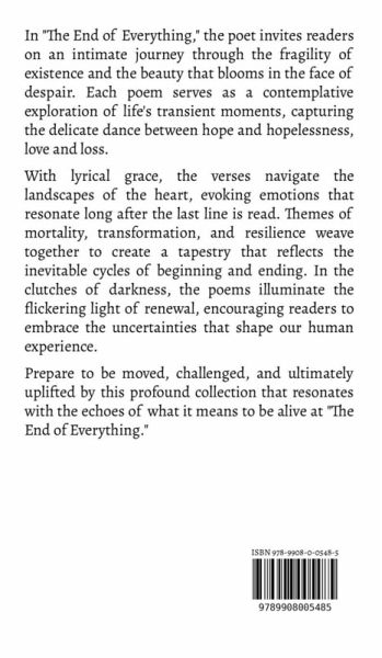 In "The End of Everything," the poet invites readers on an intimate journey through the fragility of existence and the beauty that blooms in the face of despair. Each poem serves as a contemplative exploration of life's transient moments, capturing the delicate dance between hope and hopelessness, love and loss. With lyrical grace, the verses navigate the landscapes of the heart, evoking emotions that resonate long after the last line is read. Themes of mortality, transformation, and resilience weave together to create a tapestry that reflects the inevitable cycles of beginning and ending. In the clutches of darkness, the poems illuminate the flickering light of renewal, encouraging readers to embrace the uncertainties that shape our human experience. Prepare to be moved, challenged, and ultimately uplifted by this profound collection that resonates with the echoes of what it means to be alive at "The End of Everything."