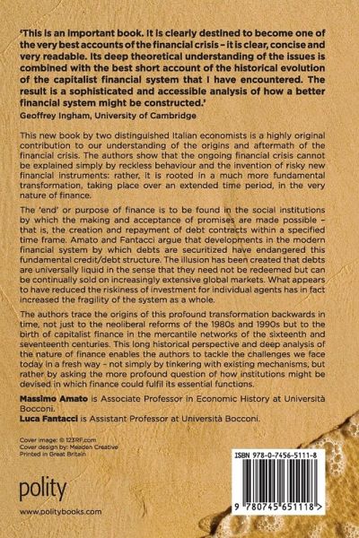 The 'end' or purpose of finance is to be found in the social institutions by which the making and acceptance of promises of payment are made possible - that is, the creation and cancellation of debt contracts within a specified time frame. Amato and Fantacci argue that developments in the modern financial system by which debts are securitized has endangered this fundamental credit/debt structure. The illusion has been created that debts are universally liquid in the sense that they need not be redeemed but can be continually sold on in increasingly extensive global markets. What appears to have reduced the riskiness of default for individual agents has in fact increased the fragility of the system as a whole.
