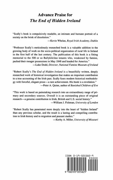 Many thousands of Irish peasants fled from the country in the terrible famine winter of 1847-48, following the road to the ports and the Liverpool ferries to make the dangerous passage across the Atlantic. The human toll of "Black '47," the worst year of the famine, is notorious, but the lives of the emigrants themselves have remained largely hidden, untold because of their previous obscurity and deep poverty. In The End of Hidden Ireland, Scally brings their lives to light. Focusing on the townland of Ballykilcline in Roscommon, Scally offers a richly detailed portrait of Irish rural life on the eve of the catastrophe. From their internal lives and values, to their violent conflict with the English Crown, from rent strikes to the potato blight, he takes the emigrants on each stage of their journey out of Ireland to New York. Along the way, he offers rare insights into the character and mentality of the immigrants as they arrived in America in their millions during the famine years. Hailed as a distinguished work of social history, this book also is a tale of adventure and human survival, one that does justice to a tragic generation with sympathy but without sentiment.
