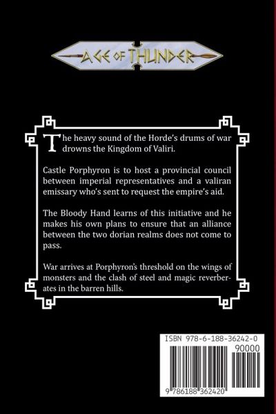 The heavy sound of the Horde's drums of war drowns the Kingdom of Valiri. Castle Porphyron is to host a provincial council between imperial representatives and a valiran emissary who's sent to request the empire's aid. The Bloody Hand learns of this initiative and he makes his own plans to ensure than an alliance between the two dorian realms does not come to pass. War arrives at Porphyron's threshold on the wings of monsters and the clash of steel and magic reverberates in the barren hills. This is an epic fantasy novel close to eighty thousand words long set in the Age of Thunder. It immerses the reader into the lives and the trials of the Dorians - the people of the spear - as the first millennium of the age comes to a close. This book is the second part of the Castle Porphyron story arc and it continues the tale that began in The Horde. Those willing to embark on an epic journey have but to open the book and turn the page.