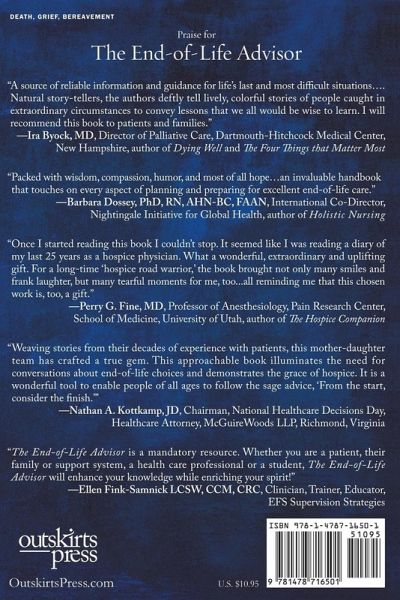 In this simple guide, you'll find both practical step-by-step advice and compassionate, heartfelt guidance to dramatically improve the last days of life. Written by a mother-daughter team of hospice professionals with experience in nursing, law and psychology, The End-of-Life Advisor will show you the remarkable benefits of hospice care. If you're a healthcare or legal professional, you'll discover the important ways you can advise your patients and clients. If you're caring for a loved one, you'll learn how you can help make their last days much more comfortable. If you're planning for yourself, you'll understand the decisions you need to make now -- so you can find greater peace down the road. You'll get basic practical information on the ways a person can make their wishes known and maintain control over their end-of-life experience. This includes living wills, power of attorney for healthcare, Do Not Resuscitate (DNR) orders, choosing hospice care, managing pain, increasing comfort, and making after-death plans. You'll also discover caring and compassionate guidance to find or lend emotional support in this difficult time. You'll recognize the importance of the conversation -- the process through which each person's end-of-life wishes are communicated to family members and friends -- and you'll see how you can help facilitate this process in your role as a doctor, nurse, lawyer, friend, or family member. Along the way, you'll find inspirational, emotional, and often humorous stories of positive end-of-life experiences -- where pain and fear were replaced with comfort and peace.