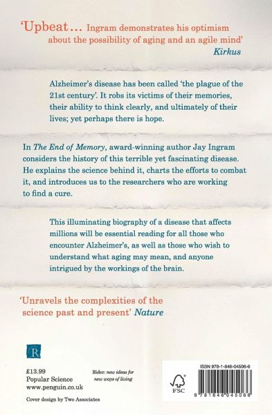 It has been called 'the plague of the 21st century' for its dramatic increase in numbers and the challenge it poses to health care. There are no effective treatments merely a few drugs that promise only short-lived results. For centuries those afflicted by Alzheimer's disease have been robbed of their memories and ability to think clearly; while families have watched their loved ones disappear day by day. In The End of Memory award-winning author Jay Ingram charts the history of the disease explaining the fascinating science behind it recounting the efforts to understand and combat it and introduces us to the passionate researchers who are working to find a cure. This is an important book for the millions of people around the world who are affected by Alzheimer's as well as those who are intrigued by both the ageing process and the brain and wish to understand them better.