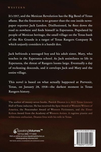 2023 FINALIST, PEACEMAKER AWARD OF WESTERN FICTIONEERS2023 FINALIST, WILL ROGERS MEDALLION AWARD It's 1917, and the Mexican Revolution has the Big Bend of Texas aflame. But the firestorm is no greater than the one inside newspaper reporter Jack Landon. Disillusioned, he flees down the road to nowhere and finds himself in Esperanza. Populated by people of Mexican heritage, the small village on the Texas bank of the Rio Grande is a target of Texas Rangers Company B, which unjustly considers it a bandit den. Jack befriends a teenaged boy and his adult sister, Mary, who teaches in the Esperanza school. As Jack assimilates to life in Esperanza, the threat of Rangers looms large. Eventually a day of reckoning descends, and it envelops Jack and Mary and the entire village. This novel is based on what actually happened at Porvenir, Texas, on January 28, 1918-the darkest moment in Texas Rangers history.