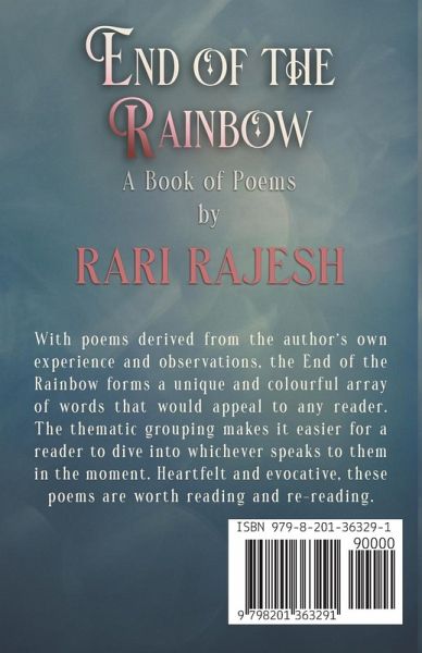 With poems derived from the author's own experience and observations, the End of the Rainbow forms a unique and colourful array of words that would appeal to any reader. The thematic grouping makes it easier for a reader to dive into whichever speaks to them in the moment. Heartfelt and evocative, these poems are worth reading and re-reading.