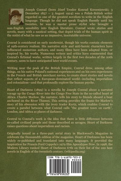 Joseph Conrad (born Józef Teodor Konrad Korzeniowski; 3 December 1857 – 3 August 1924) was a Polish-British writer regarded as one of the greatest novelists to write in the English language. Though he did not speak English fluently until his twenties, he was a master prose stylist who brought a non-English sensibility into English literature. Conrad wrote stories and novels, many with a nautical setting, that depict trials of the human spirit in the midst of what he saw as an impassive, inscrutable universe. Conrad is considered an early modernist, though his works contain elements of 19th-century realism. His narrative style and anti-heroic characters have influenced numerous authors, and many films have been adapted from, or inspired by, his works. Numerous writers and critics have commented that Conrad's fictional works, written largely in the first two decades of the 20th century, seem to have anticipated later world events. Writing near the peak of the British Empire, Conrad drew, among other things, on his native Poland's national experiences and on his own experiences in the French and British merchant navies, to create short stories and novels that reflect aspects of a European-dominated world—including imperialism and colonialism—and that profoundly explore the human psyche. Heart of Darkness (1899) is a novella by Joseph Conrad about a narrated voyage up the Congo River into the Congo Free State in the so-called heart of Africa. Charles Marlow, the narrator, tells his story to friends aboard a boat anchored on the River Thames. This setting provides the frame for Marlow's story of his obsession with the ivory trader Kurtz, which enables Conrad to create a parallel between what Conrad calls "the greatest town on earth", London, and Africa as places of darkness. Central to Conrad's work is the idea that there is little difference between so-called civilized people and those described as savages; Heart of Darkness raises questions about imperialism and racism. Originally issued as a three-part serial story in Blackwood's Magazine to celebrate the thousandth edition of the magazine, Heart of Darkness has been widely re-published and translated into many languages. It provided the inspiration for Francis Ford Coppola's 1979 film Apocalypse Now. In 1998, the Modern Library ranked Heart of Darkness 67th on their list of the 100 best novels in English of the twentieth century. (wikipedia.org)