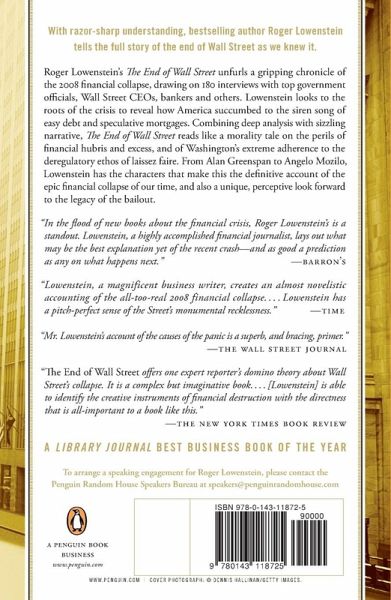 Roger Lowenstein's The End of Wall Street unfurls a gripping chronicle of the 2008 financial collapse, drawing on 180 interviews with top government officials and Wall Street CEOs. Lowenstein looks to the roots of the crisis to reveal how America succumbed to the siren song of easy debt and speculative mortgages. Combining deep analysis with sizzling narrative, The End of Wall Street charts the end of an era of unprecedented and unwarranted optimism while looking ahead to the legacy of the bailout.