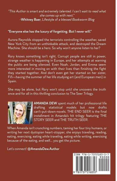 "Everyone else has the luxury of forgetting. But I never will." Aurora Reynolds stopped the terrorists controlling the weather, saved New York City from an unthinkable attack, and destroyed the Dream Machine. She should be a hero. So then why won't anyone listen to her? Rory knows something isn't right. Corrupt people are still in power, strange weather is happening in Europe, and her attempts at warning the public are being silenced. Even Noah, Jordan, and Emma seem more interested in moving on with their lives than finishing the fight they started together. And don't even get her started on her sister, Fifi-having the summer of her life studying art (and European men) in Spain. She may be alone, but Rory won't stop until she uncovers the truth once and for all in this thrilling conclusion of The Seer Trilogy.