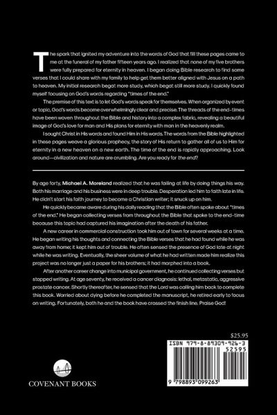 The spark that ignited my adventure into the words of God that fill these pages came to me at the funeral of my father fifteen years ago. I realized that none of my five brothers were fully prepared for eternity in heaven. I began doing Bible research to find some verses that I could share with my family to help get them better aligned with Jesus on a path to heaven. My initial research begat more study, which begat still more study. I quickly found myself focusing on God's words regarding "times of the end." The premise of this text is to let God's words speak for themselves. When organized by event or topic, God's words become overwhelmingly clear and precise. The threads of the end-times have been woven throughout the Bible and history into a complex fabric, revealing a beautiful image of God's love for man and His plans for eternity with man in the heavenly realm. I sought Christ in His words and found Him in His words. The words from the Bible highlighted in these pages weave a glorious prophecy, the story of His return to gather all of us to Him for eternity in a new heaven on a new earth. The time of the end is rapidly approaching. Look around--civilization and nature are crumbling. Are you ready for the end?