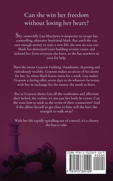 Can she win her freedom without losing her heart? Shy, unworldly Lisa Matthews is desperate to escape her controlling, obsessive boyfriend Mark. But until she can save enough money to start a new life, she sees no way out. Mark has destroyed Lisa's budding artistic career and isolated her from everyone she loves, so she has nowhere to turn for help. Then she meets Grayson Fielding. Handsome, charming and ridiculously wealthy, Grayson makes no secret of his desire for her. So when Mark leaves town for a week, Lisa makes Grayson a daring offer: seven days to do whatever he wants with her in exchange for the money she needs to leave. But as Grayson shows Lisa all the tenderness and affection she's lacked, she realises it's not just her body he craves. Can she trust him to stick to the terms of their transaction? And if she allows herself to get close to him, will she have the strength to walk away? With her life rapidly spiralling out of control, it's a chance she has to take.