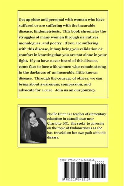 Get up close and personal with women who have suffered or are suffering with the incurable disease, Endometriosis. This book chronicles the struggles of many women through narratives, monologues, and poetry. If you are suffering with this disease, it may bring you validation or comfort in knowing that you are not alone in your fight. If you have never heard of this disease, come face to face with women who remain strong in the darkness of an incurable, little known disease. Through the courage of others, we can bring about awareness, compassion, and advocate for a cure. Join us on our journey.