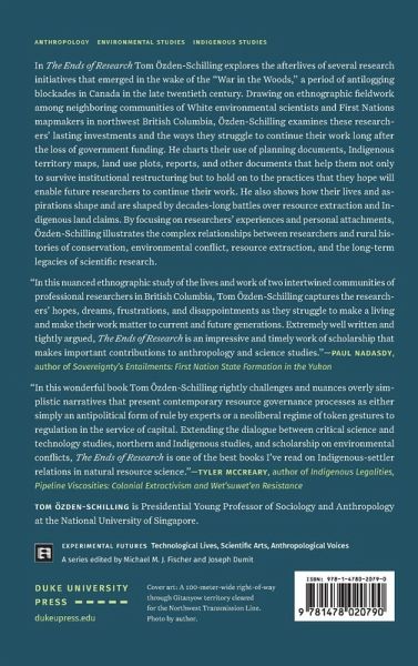 In The Ends of Research Tom Özden-Schilling explores the afterlives of several research initiatives that emerged in the wake of the "War in the Woods," a period of anti-logging blockades in Canada in the late twentieth century. Drawing on ethnographic fieldwork among neighboring communities of White environmental scientists and First Nations mapmakers in northwest British Columbia, Özden-Schilling examines these researchers' lasting investments and the ways they struggle to continue their work long after the loss of government funding. He charts their use of planning documents, Indigenous territory maps, land use plots, reports, and other documents that help them not only to survive institutional restructuring but to hold on to the practices that they hope will enable future researchers to continue their work. He also shows how their lives and aspirations shape and are shaped by decades-long battles over resource extraction and Indigenous land claims. By focusing on researchers' experiences and personal attachments, Özden-Schilling illustrates the complex relationships between researchers and rural histories of conservation, environmental conflict, resource extraction, and the long-term legacies of scientific research.