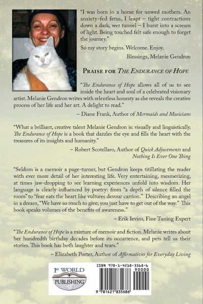 Melanie Gendron attended The School of the Museum of Fine Arts, Boston in affiliation with Tufts University, majoring in sculpture and painting. Studies in photography, print making, fashion design and computer arts further rounded out her curriculum. She developed a unique style rich in symbolism inspired by many cultures. Proficient in a variety of media, Melanie enjoys a renaissance attitude. Serving as animator, art director, author, book designer, fashion designer, graphic artist, illustrator, intuitive counselor, poet, painter, portraitist, teacher, and writer, she is a seasoned multimedia professional artist. Among her publications are A Goddess Journal, Making the Connection to Self, Love, Life, The Gendron Tarot Deck and Book, This Fool's Journey Through Tarot's Major Arcana, Dreaming The Light, Metatron, Angel of The Presence, and A Goddess Coloring Book. Melanie currently manages Gendron Studios in the Santa Cruz Mountains of California, creating her art, and offering commercial art services, specializing in book design. "The Endurance of Hope allows all of us to see inside the heart and soul of a celebrated visionary artist. Melanie Gendron writes with relentless honesty as she reveals the creative process of her life and her art. A delight to read." - Diane Frank, Author of Mermaids and Musicians "What a brilliant, creative talent Melanie Gendron is: visually and linguistically. The Endurance of Hope is a book that dazzles the eye and fills the heart with the treasures of its insights and humanity." - Robert Scotellaro, Author of Quick Adjustments and Nothing Is Ever One Thing "Seldom is a memoir a page-turner, but Gendron keeps titillating the reader with ever more detail of her interesting life. Very entertaining, mesmerizing, at times jaw-dropping to see learning experiences unfold into wisdom. Her language is clearly influenced by poetry: from "a depth of silence filled the room" to "fear eats the heart like vultures devour carrion." Describing an angel in a dream, "We have so much to give; you just have to get out of the way." This book speaks volumes of the benefits of awareness." - Erik Ievins, Fine Tuning Expert "The Endurance of Hope is a mixture of memoir and fiction. Melanie writes about her hundredth birthday decades before its occurrence, and pets tell us their stories. This book has both laughter and tears." - Elizabeth Porter, Author of Affirmations for Everyday Living