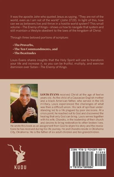 It was the apostle John who quoted Jesus as saying, "They are not of the world, even as I am not of the world" (John 17:19). In light of this, how can we as believers live and thrive in a hostile world system? This small volume-The Enemy of Kings-shows us how to navigate that system and still maintain a lifestyle obedient to the laws of the kingdom of Christ. Through three beloved portions of scripture: ¿ The Proverbs,¿ The Ten Commandments, and¿ The Beatitudes Louis Evans shares insights that the Holy Spirit will use to transform your life and increase it, so you can be fruitful, multiply, and exercise dominion over Satan-The Enemy of Kings.