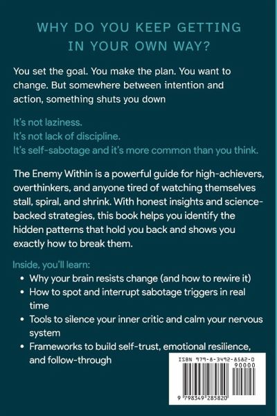 Why do you keep talking yourself out of opportunities you actually want? Why do you procrastinate even when you know what to do? Why does it feel like something inside you always pulls the brake just as you're about to move forward? There's nothing wrong with you. You're just following the mental script that's been running your life without your permission. The Enemy Within is not another self-help book stuffed with surface-level advice. It's your 90-day blueprint to break the cycle of overthinking, perfectionism, self-doubt, and fear-based habits and finally start leading your life with calm confidence and clarity. Inside this no-fluff guide, you'll discover: How your brain creates sabotage patterns and how to stop them Tools to regulate your emotions and silence your inner critic Journaling prompts and self-reflection exercises that expose the beliefs holding you back CBT-based methods to rewrite your thoughts and take action - even when fear shows up How to become the version of you that follows through and no longer self-destructs at the finish line This book will not just inspire you for a day. It will equip you for a lifetime. If you're tired of starting over, tired of doubting yourself, and tired of being stuck in your own head - it's time to fight back. Order The Enemy Within now and break the cycle that's been keeping you small. Because your future self isn't waiting for perfect, she's waiting for you to stop sabotaging.