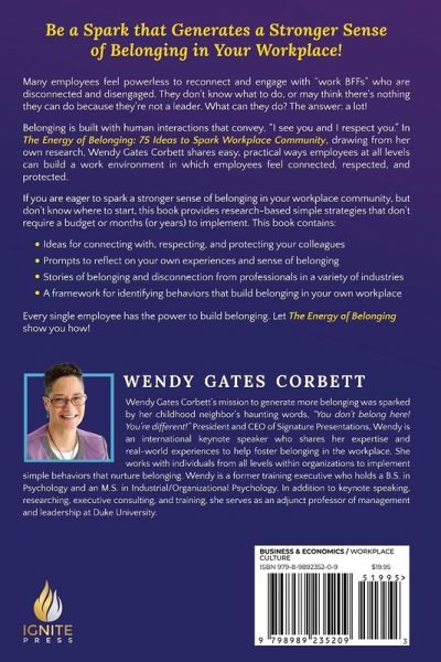 Be a spark that generates a stronger sense of belonging in your workplace! Many employees feel powerless to reconnect and engage with "work BFFs" who are disconnected and disengaged. They don't know what to do, or may think there's nothing they can do because they're not a leader. What can they do? The answer: a lot! Belonging is built with human interactions that convey, "I see you, I respect you." In The Energy of Belonging: 75 Ideas to Spark Workplace Community, drawing from her own research, Wendy Gates Corbett shares easy, practical ways employees at all levels can build a work environment in which employees feel connected, respected, and protected. If you are eager to spark a stronger sense of belonging in your workplace community, but don't know where to start, this book provides research-based simple strategies that don't require a budget or months (or years) to implement. This book contains:Ideas for connecting with, respecting, and protecting your colleagues Prompts to reflect on your own experiences and sense of belonging Stories of belonging and disconnection from professionals in a variety of industries A framework for identifying behaviors that build belonging in your own workplace Every single employee has the power to build belonging. Let The Energy of Belonging show you how!