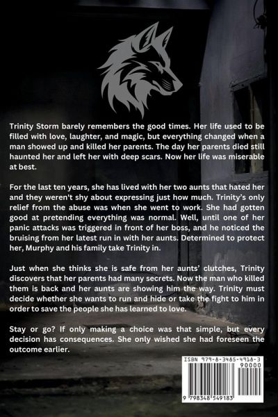 Trinity Storm barely remembers the good times. Her life used to be filled with love, laughter, and magic, but everything changed when a man showed up at their house and killed her parents while she was hidden away in an underground bunker. The day her parents died still haunted her and left her with deep scars. Now her life was miserable at best. For the last ten years, she has lived with her two aunts that hated her and they weren't shy about expressing just how much. Trinity's only relief from the abuse was when she went to work. She had gotten good at pretending everything was normal. Well, until one of her panic attacks was triggered in front of her boss, Murphy, and he noticed the bruising from her latest run in with her aunts. Determined to protect her, Murphy, his nephews, and his niece take Trinity in. She gets along well with everyone but Axel; they were like oil and water. Just when she thinks she is safe from her aunts' clutches, Trinity discovers that her parents had many secrets. Now the man who killed them is back and her aunts were showing him the way. Trinity must decide whether she wants to run and hide or take the fight to him in order to save the people she has learned to love. Stay or go? If only making a choice was that simple, but every decision has consequences. She only wished she had foreseen the outcome earlier.
