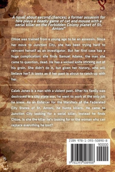 "This is novel about second chances." "Mix a shoot-em-up western, Victorian steampunk, a trip through a wormhole, then add a dash of mystery and romance..." "A former assassin for hire plays a deadly game of cat and mouse with a serial killer on the Forbidden Colony planet of St. Antoni" Chloe was trained from a young age to be an assassin. Since her move to Junction City, she has been trying hard to reinvent herself as an investigator. But her first case has a huge complication: she finds Samuel Adams, the man she came to question, dead. He has a wicked knife sticking out of his groin. She didn't do it, but given her history, who will believe her? It looks as if her past is about to catch up with her. Caleb Jones is a man with a violent past. After his family was destroyed in a city state war, he went to work at the only job he knew. As an Enforcer for the Marshals of the Federated City States of St. Antoni, he hunts killers. He came to Junction City looking for a serial killer. Instead he finds Chloe. Is she the killer he's looking for or the woman who can replace everything he lost?