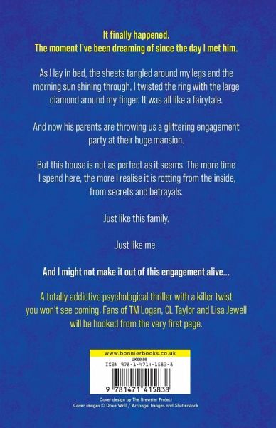 'I could not put it down!... Will definitely be sending it out to friends for a great read! It had me wanting more and more!' Reader review, 5 stars It finally happened. The moment I've been dreaming of since the day I met him. As I lay in bed, the sheets tangled around my legs and the morning sun shining through, I twisted the ring with the large diamond around my finger. It was all like a fairytale. And now his parents are throwing us a glittering engagement party at their huge mansion. But this house is not as perfect as it seems. The more time I spend here, the more I realise it is rotting from the inside, from secrets and betrayals. Just like this family. Just like me. And I might not make it out of this engagement alive... A totally addictive psychological thriller with a killer twist you won't see coming. Fans of TM Logan, CL Taylor and Lisa Jewell will be hooked from the very first page. Readers are gripped by The Engagement Party: 'Heart pounding thriller that left me on the edge of my seat' Reader review, 5 stars 'Mysterious, suspenseful and unputdownable. The interwoven mystery and twists and turns will keep you on edge... The ending shocked me' Reader review, 5 stars