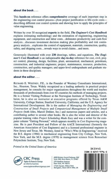 Offers coverage of each important step in engineering cost control process, from project justification to life-cycle costs. The book describes cost control systems and shows how to apply the principles of value engineering. It explains estimating methodology and the estimation of engineering, engineering equipment, and construction and labour costs; delineates productivity and cash-flow analysis; and more.