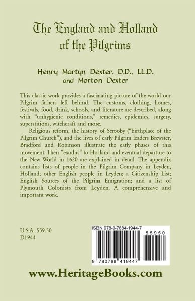This classic work provides a fascinating picture of the world our Pilgrim fathers left behind. The customs, clothing, homes, festivals, food, drink, schools, and literature are described, along with "unhygienic conditions," remedies, epidemics, surgery, superstitions, witchcraft and more. Religious reform, the history of Scrooby ("birthplace of the Pilgrim Church"), and the lives of early Pilgrim leaders Brewster, Bradford and Robinson illustrate the early phases of this movement. Their "exodus" to Holland and eventual departure to the New World in 1620 are explained in detail. The appendix contains lists of people in the Pilgrim Company in Leyden, Holland; other English people in Leyden; a Citizenship List; English Sources of the Pilgrim Emigration; and a list of Plymouth Colonists from Leyden.