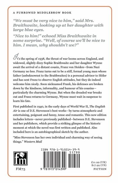 "We must be very nice to him," said Mrs. Braithwaite, looking up at her daughter with large blue eyes. "Nice to him!" echoed Miss Braithwaite in some surprise. "Well, of course we'll be nice to him. I mean, why shouldn't we?" It's the spring of 1938, the threat of war looms across England, and widowed, slightly dizzy Sophie Braithwaite and her daughter Wynne await the arrival of a distant cousin, Franz von Heiden-from Nazi Germany no less. Franz turns out to be a stiff, formal young man whose father (unbeknownst to the Braithwaites) is a personal advisor to Hitler and has sent Franz to observe English attitudes, but they do indeed welcome him nicely. Soon nicknamed Frank, his defenses are broken down by the kindness, informality, and humour of his cousins-particularly the charming Wynne. But when the dreaded war breaks out and Franz returns to Germany, Wynne must wait in suspense to learn his fate. First published in 1940, in the early days of World War II, The English Air is one of D.E. Stevenson's best works-by turns atmospheric and entertaining, poignant and funny, tense and romantic. This new edition includes letters-never previously published-between D.E. Stevenson and her publishers, which provide a striking glimpse of the historic moment at which the novel was first written and published. Also included here is an autobiographical sketch by the author. "Miss Stevenson has her own individual and charming way of seeing things." Western Mail