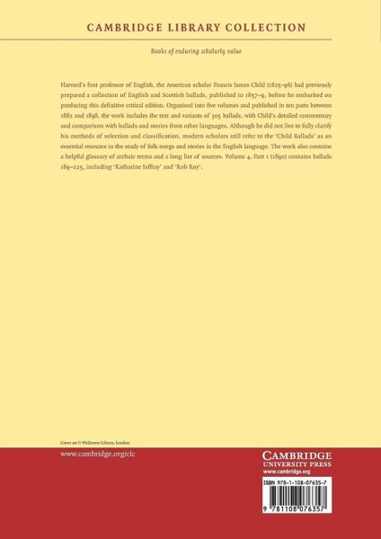 Harvard's first professor of English, the American scholar Francis James Child (1825-96) had previously prepared a collection of English and Scottish ballads, published in 1857-9, before he embarked on producing this definitive critical edition. Organised into five volumes and published in ten parts between 1882 and 1898, the work includes the text and variants of 305 ballads, with Child's detailed commentary and comparison with ballads and stories from other languages. Although he did not live to fully clarify his methods of selection and classification, modern scholars still refer to the 'Child Ballads' as an essential resource in the study of folk songs and stories in the English language. The work also contains a helpful glossary of archaic terms and a long list of sources. Volume 4, Part 1 (1890) contains ballads 189-225, including 'Katharine Jaffray' and 'Rob Roy'.