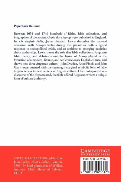 Between 1651 and 1740 there was in England an explosion of interest in Aesop's fables, and in the fable as a literary form. Jayne Elizabeth Lewis shows how the fable, often underestimated because of its links with popular non-literary forms, played a major role in the formation of modern English culture.