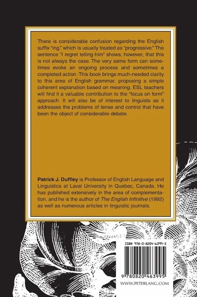 There is considerable confusion regarding the English suffix "ing," which is usually treated as "progressive." The sentence "I regret telling him" shows, however, that this is not always the case. The very same form can sometimes evoke an ongoing process and sometimes a completed action. This book brings much-needed clarity to this area of English grammar, proposing a simple coherent explanation based on meaning. ESL teachers will find it a valuable contribution to the "focus on form" approach. It will also be of interest to linguists as it addresses the problems of tense and control that have been the object of considerable debate.