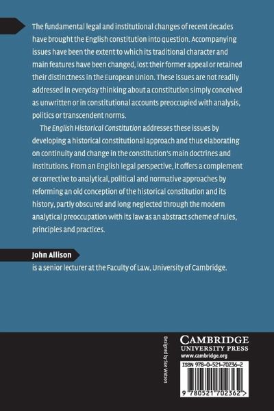The fundamental legal and institutional changes of recent decades have brought the English constitution into question. Accompanying issues have been the extent to which its traditional character and main features have been changed, lost their former appeal or retained their distinctness in the European Union. These issues are not readily addressed in everyday thinking about a constitution simply conceived as unwritten or in constitutional accounts preoccupied with analysis, politics or transcendent norms. The English Historical Constitution addresses these issues by developing a historical constitutional approach and thus elaborating on continuity and change in the constitution's main doctrines and institutions. From an English legal perspective, it offers a complement or corrective to analytical, political and normative approaches by reforming an old conception of the historical constitution and its history, partly obscured and long neglected through the modern analytical preoccupation with its law as an abstract scheme of rules, principles and practices.