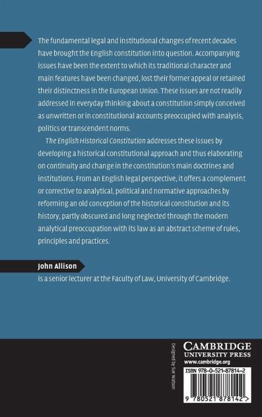 The fundamental legal and institutional changes of recent decades have brought the English constitution into question. Accompanying issues have been the extent to which its traditional character and main features have been changed, lost their former appeal or retained their distinctness in the European Union. These issues are not readily addressed in everyday thinking about a constitution simply conceived as unwritten or in constitutional accounts preoccupied with analysis, politics or transcendent norms. The English Historical Constitution addresses these issues by developing a historical constitutional approach and thus elaborating on continuity and change in the constitution's main doctrines and institutions. From an English legal perspective, it offers a complement or corrective to analytical, political and normative approaches by reforming an old conception of the historical constitution and its history, partly obscured and long neglected through the modern analytical preoccupation with its law as an abstract scheme of rules, principles and practices.