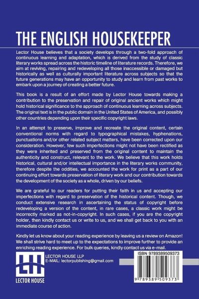 The English Housekeeper: Or, Manual Of Domestic Management: Containing Advice On The Conduct Of Household Affairs, And Practical Instructions (Improved By The Introduction Of Many New Receipts) This book is a result of an effort made by us towards making a contribution to the preservation and repair of original classic literature. In an attempt to preserve, improve and recreate the original content, we have worked towards: 1. Type-setting & Reformatting: The complete work has been re-designed via professional layout, formatting and type-setting tools to re-create the same edition with rich typography, graphics, high quality images, and table elements, giving our readers the feel of holding a 'fresh and newly' reprinted and/or revised edition, as opposed to other scanned & printed (Optical Character Recognition - OCR) reproductions. 2. Correction of imperfections: As the work was re-created from the scratch, therefore, it was vetted to rectify certain conventional norms with regard to typographical mistakes, hyphenations, punctuations, blurred images, missing content/pages, and/or other related subject matters, upon our consideration. Every attempt was made to rectify the imperfections related to omitted constructs in the original edition via other references. However, a few of such imperfections which could not be rectified due to intentional\unintentional omission of content in the original edition, were inherited and preserved from the original work to maintain the authenticity and construct, relevant to the work. We believe that this work holds historical, cultural and/or intellectual importance in the literary works community, therefore despite the oddities, we accounted the work for print as a part of our continuing effort towards preservation of literary work and our contribution towards the development of the society as a whole, driven by our beliefs. We are grateful to our readers for putting their faith in us and accepting our imperfections with regard to preservation of the historical content. HAPPY READING!