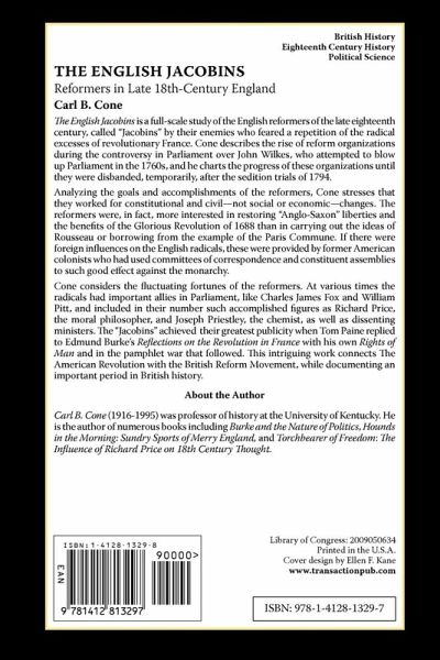 The English Jacobins is a full-scale study of the English reformers of the late eighteenth century, called ""Jacobins"" by their enemies who feared a repetition of the radical excesses of revolutionary France. Cone describes the rise of reform organizations during the controversy in Parliament over John Wilkes, who attempted to blow up Parliament in the 1760s, and he charts the progress of these organizations until they were disbanded, temporarily, after the sedition trials of 1794. Analyzing the goals and accomplishments of the reformers, Cone stresses that they worked for constitutional and civil not social or economic changes. The reformers were, in fact, more interested in restoring ""Anglo-Saxon"" liberties and the benefits of the Glorious Revolution of 1688 than in carrying out the ideas of Rousseau or borrowing from the example of the Paris Commune. If there were foreign influences on the English radicals, these were provided by former American colonists who had used committees of correspondence and constituent assemblies to such good effect against the monarchy. Cone considers the fluctuating fortunes of the reformers. At various times the radicals had important allies in Parliament, like Charles James Fox and William Pitt, and included in their number such accomplished figures as Richard Price, the moral philosopher, and Joseph Priestley, the chemist, as well as dissenting ministers. The ""Jacobins"" achieved their greatest publicity when Tom Paine replied to Edmund Burke's Reflections on the Revolution in France with his own Rights of Man and in the pamphlet war that followed. This intriguing work connects The American Revolution with the British Reform Movement, while documenting an important period in British history.