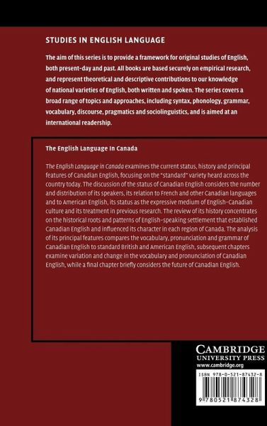 The English Language in Canada examines the current status, history and principal features of Canadian English, focusing on the 'standard' variety heard across the country today. The discussion of the status of Canadian English considers the number and distribution of its speakers, its relation to French and other Canadian languages and to American English, its status as the expressive medium of English Canadian culture and its treatment in previous research. The review of its history concentrates on the historical roots and patterns of English-speaking settlement that established Canadian English and influenced its character in each region of Canada. The analysis of its principal features compares the vocabulary, pronunciation and grammar of Canadian English to standard British and American English. Subsequent chapters examine variation and change in the vocabulary and pronunciation of Canadian English, while a final chapter briefly considers the future of Canadian English.